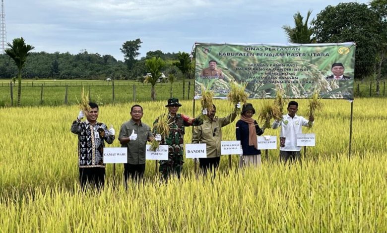 Timur Media, Penajam – Dalam rangka mendukung swasembada pangan di Kabupaten Penajam Paser Utara (PPU) Dinas Pertanian Kabupaten PPU bekerja sama dengan Badan standarisasi instrumen pertanian (BSIP) Kementerian Pertanian, Provinsi Kalimantan Timur (Kaltim) mengelar gerakan panen padi yang melibatkan Kelompok Tani (Poktan) Sipatuo, Desa Sesulu, Kecamatan Waru, Kabupaten PPU, Kamis (13/3/2025).